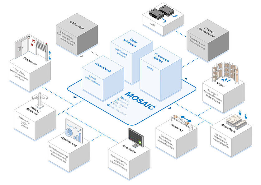 MOSAIC steht für Modular System of Automation, IOT and Communication. Die Software basiert auf einer Architektur aus vielen miteinander kommunizierenden Diensten und ermöglicht die Verwaltung sowie Steuerung von einfachen Maschinen bis zu komplexen Anlagen, wobei je nach Kundenkonzept mehr oder weniger Module in Ergänzung zu dem Basissystem zum Einsatz kommen. Flexibel & skalierbar - wir konfigurieren exakt für Ihre Anforderungen – von der Simulation bis zur Auslieferung.