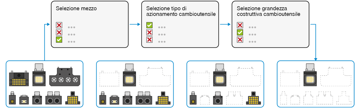 Per trovare l'elemento di connessione giusto, la selezione viene ridotta utilizzando una funzione di filtro preliminare. Se non sono disponibili tutte le informazioni e non è possibile impostare il filtro, possono essere sempre visualizzati tutti gli elementi di connessione che soddisfano i criteri del filtro precedente. Se vengono visualizzati elementi di connessione, questi vengono ordinati in base al cambioutensile e al numero di passaggi mezzi.