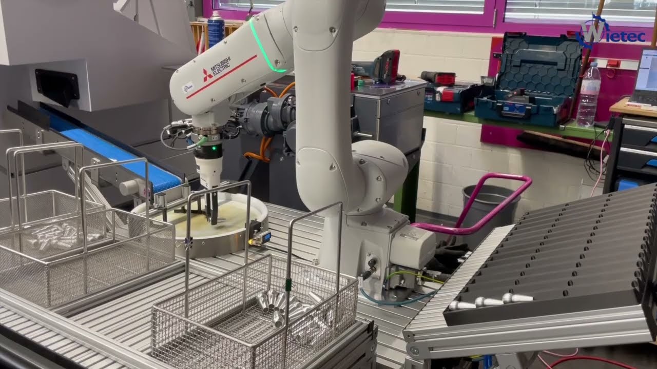Met het MCS Mobile Cobot Station van @Wietec GmbH worden gedraaide onderdelen rechtstreeks uit een Citizen M32 gehaald en vervolgens voorzichtig in wasmanden geplaatst. Het proces zorgt niet alleen voor een gelijkmatige verdeling, maar plaatst op verzoek van de klant ook regelmatig een testdeel apart. Op deze manier kan de kwaliteit van de onderdelen tijdens het hele proces te allen tijde worden gewaarborgd. De Melfa Assista Cobot van @Mitsubishi Electric - Factory Automation EMEA wordt gebruikt in deze aantrekkelijke oplossing, die samen met twee componenten van de Zimmer Groep zorgt voor maximale efficiëntie: