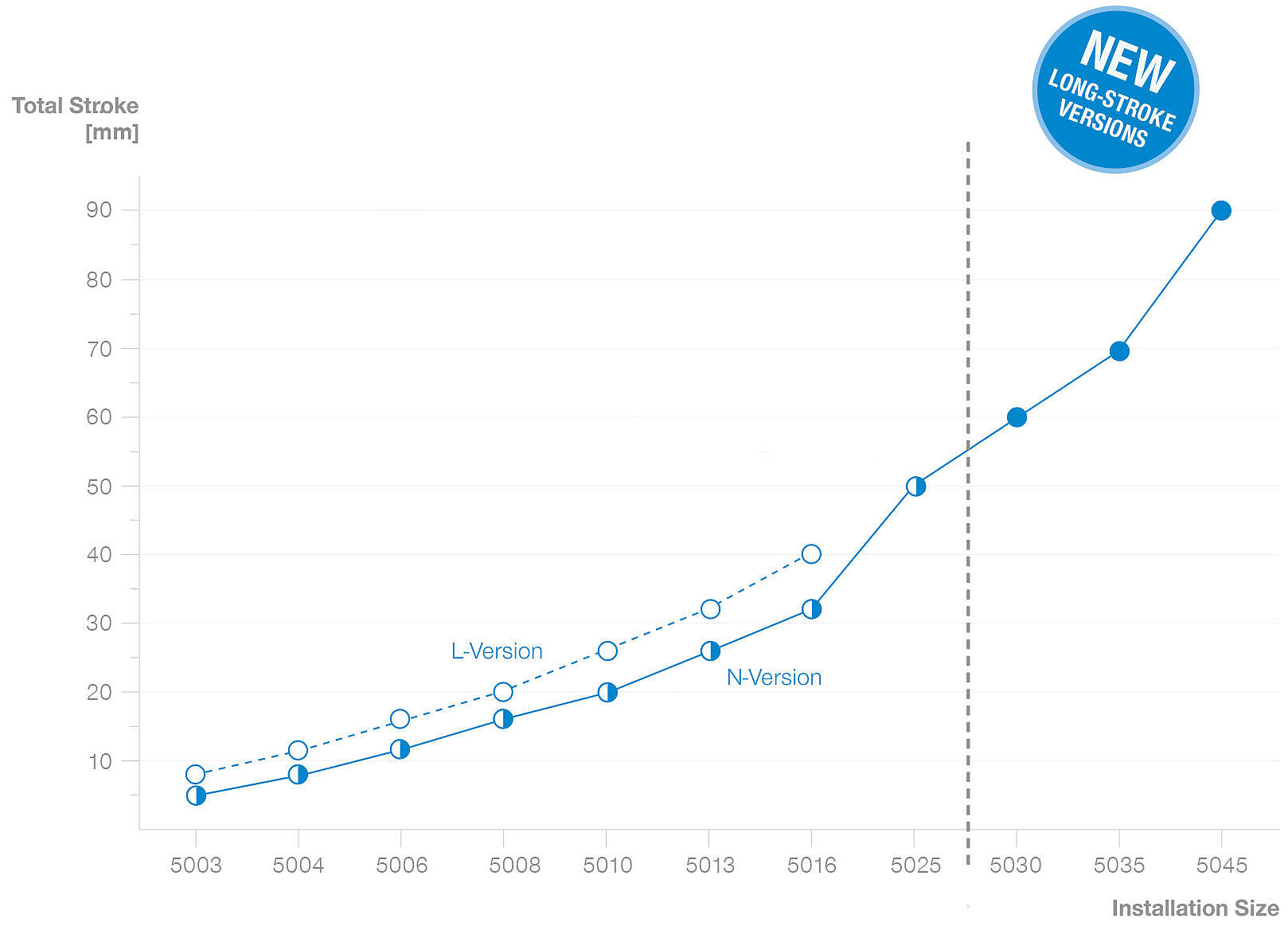 większy skok przy identycznym rozmiarze w wersji Long Stroke.