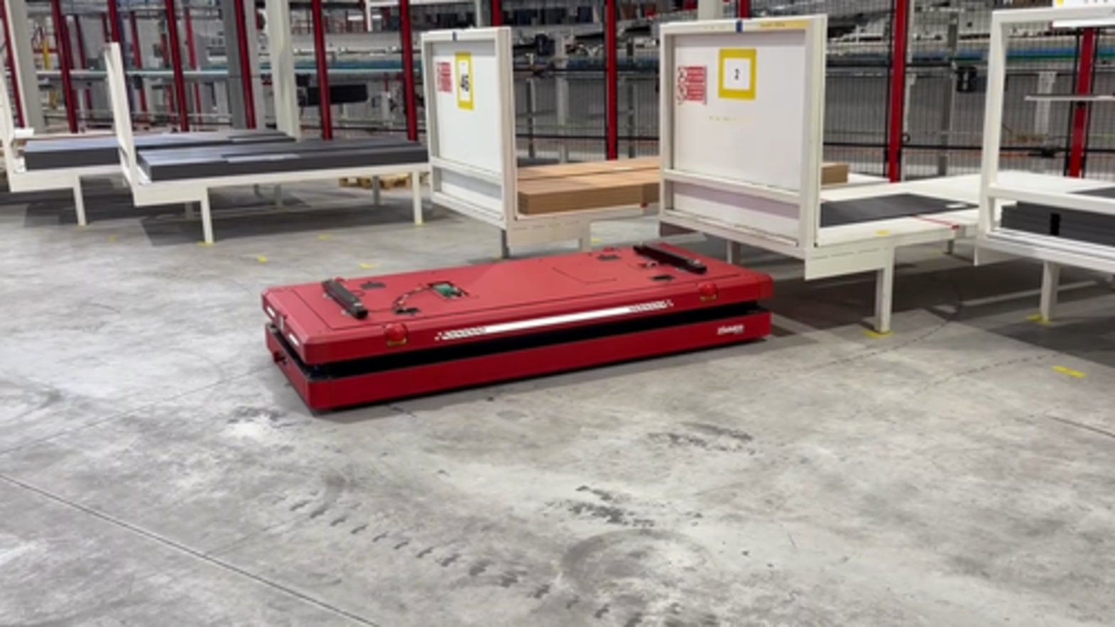 Automatyczny, odłączony transport niestandardowych regałów transportowych o ładowności do 3,5 t między dwoma procesami produkcyjnymi w przemyśle meblarskim.
