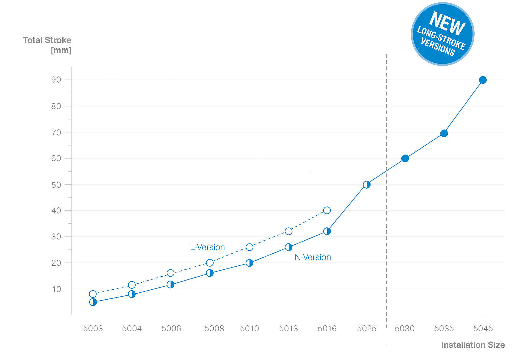 行程——在相同安装尺寸下,通过长行程 型号实现。