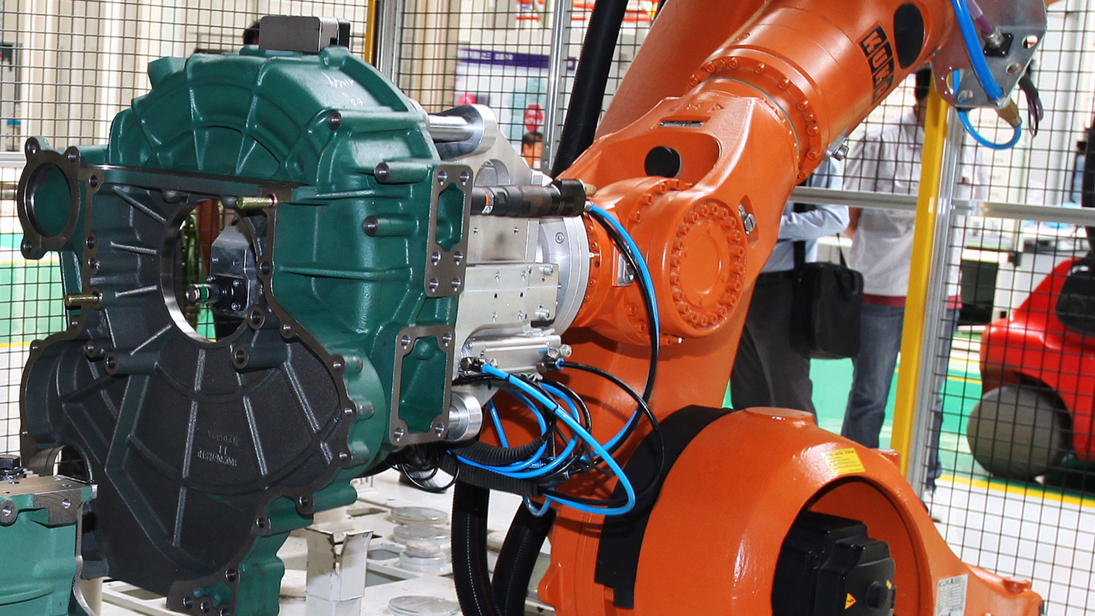 Bei der automatisierten Montage von einem Schwungradgehäuse musste ein Greifer das Bauteil aufnehmen und anschließend am Motorblock montieren. Besondere Herausforderungen waren dabei die hohe Teilevielfalt sowie das Vormontieren der Gehäuse.