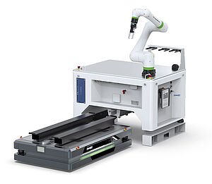 In this setup, the AMR takes over collection, transport and positioning of the flexible ZiMo robot cell. Then, the AMR takes on other tasks such as pallet transport. Thanks to the modular setup and a voltage supply from batteries, the ZiMo can be used with versatility.