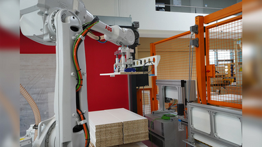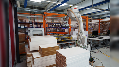 Cellule d'usinage qui peut réaliser aussi bien la manipulation que l'usinage de pièces dans un format compact. Les fonds d'armoires sont usinés pour l'industrie de la cuisine. L'installation permet également de monter des pieds d'armoires de manière entièrement automatique.