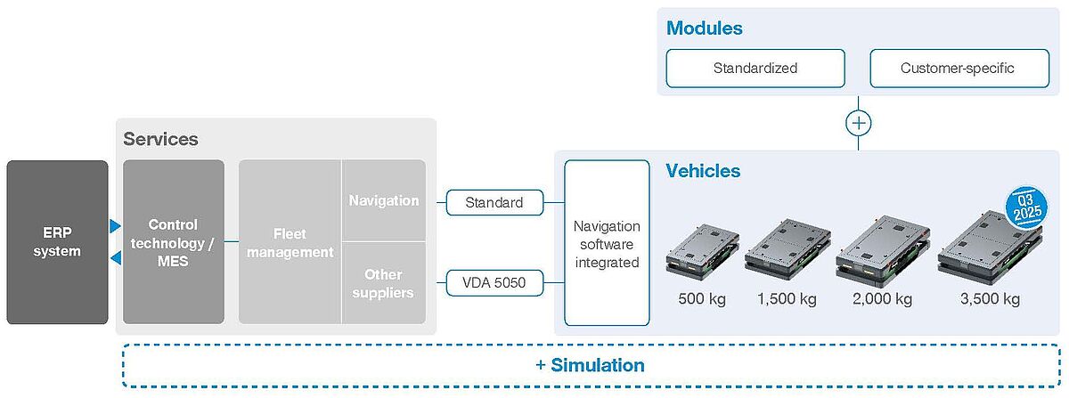 此外,我们还提供合适的接口 (VDA 5050) 用于接入控制系统和 ERP 系统。集成的诊断系统则有助于您制定前瞻性计划,从而实现高可用性。您可以轻松将看板流程提升到新的水平,并使用正确的软件控制安全、智能的车队管理。